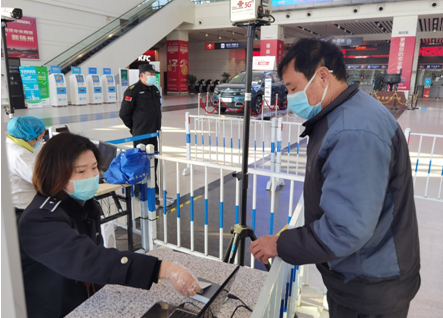 進(jìn)站口,車站的工作人員嚴(yán)格佩戴口罩,手套,正對(duì)進(jìn)站乘車的旅客進(jìn)行體溫、健康碼、身份證等的檢查。